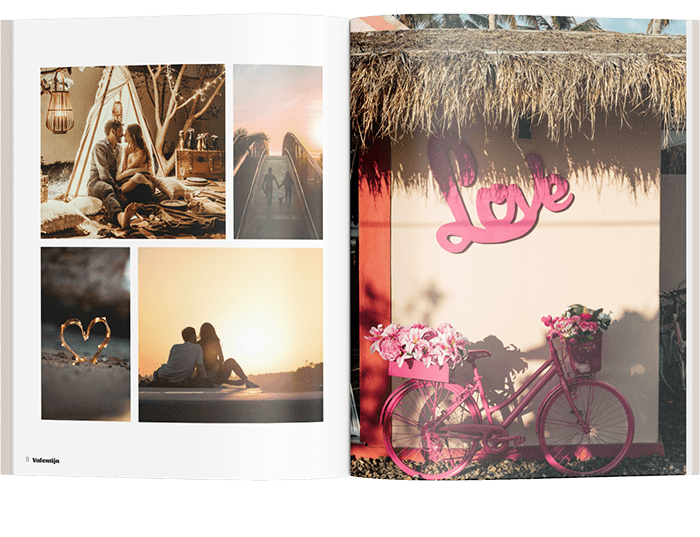 Een magazine bevat vaak veel verhalen, maar deze kun je natuurlijk ook maken als fotoalbum. Maak collages of fotopagina’s met de mooiste foto’s van jullie samen. Voeg als je dat wilt grappige bijschriften of lieve teksten toe die herinneringen oproepen. Denk aan vakanties, dagjes weg of spontane selfies.